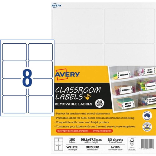 Avery Classroom Labels Laser Printer 99.1 x 67.7mm White 8UP 160 Labels