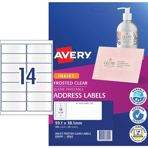 Avery Frosted Clear Inkjet Address Labels J8563 99.1x38.1mm 14UP 350 Labels
