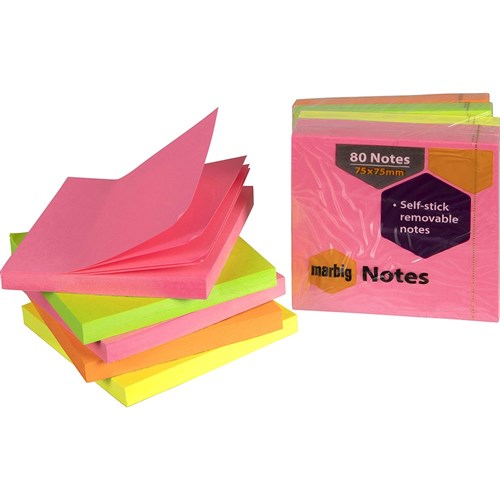 Marbig Repositionable Notes 75 x 75mm Brilliant Neon 80 Sheet Pad Assorted Pack Of 5