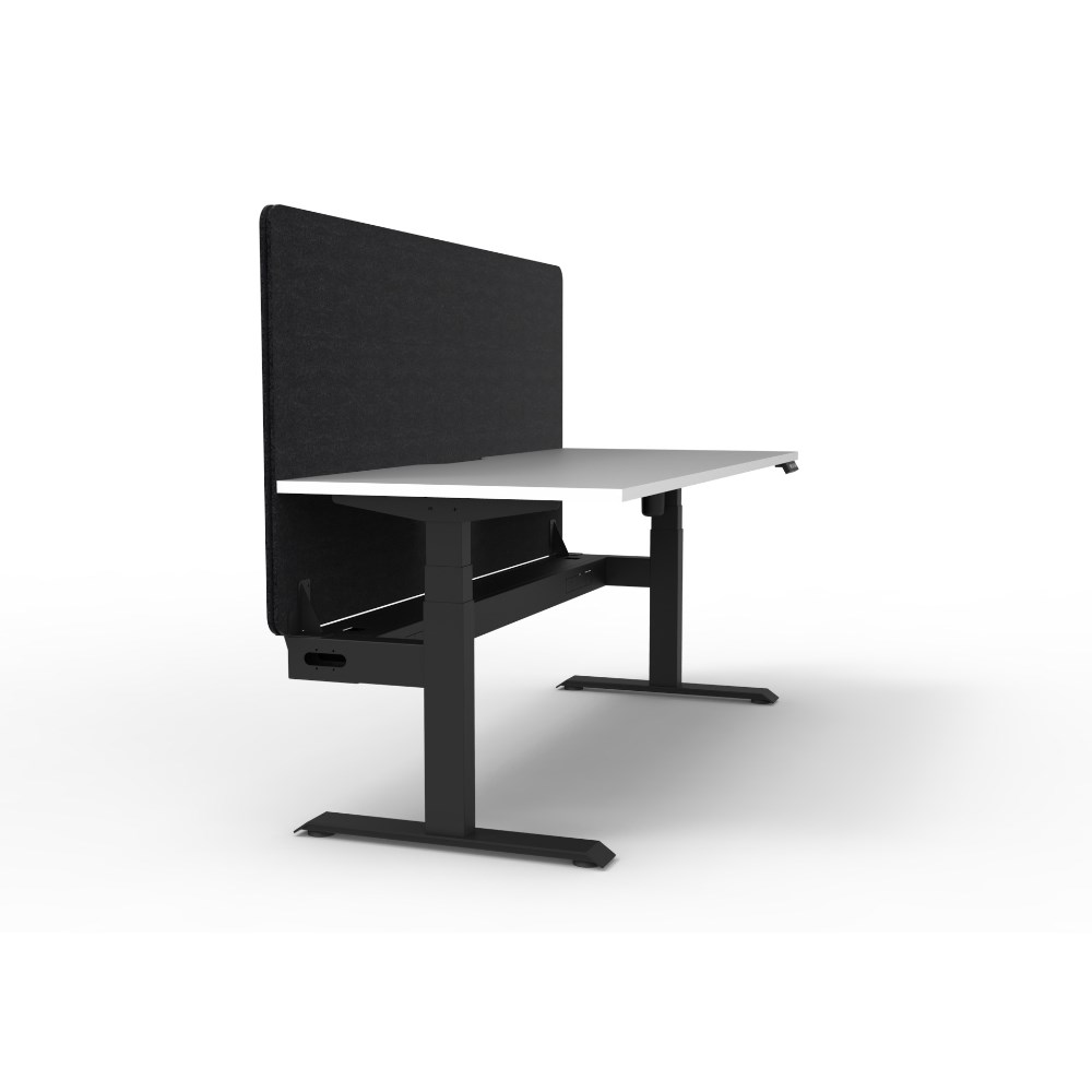 • Electric height adjustable single sided workstation with Natural White top and Black Satin frame, Black Eco screen and cable tray.