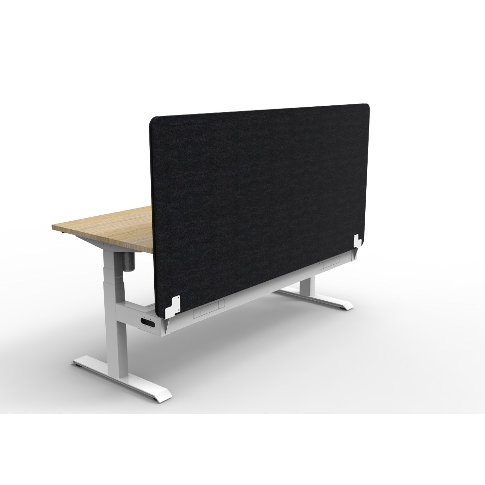 • Electric height adjustable single sided workstation with Natural Oak top and White Satin frame, Black Eco screen and cable tray.