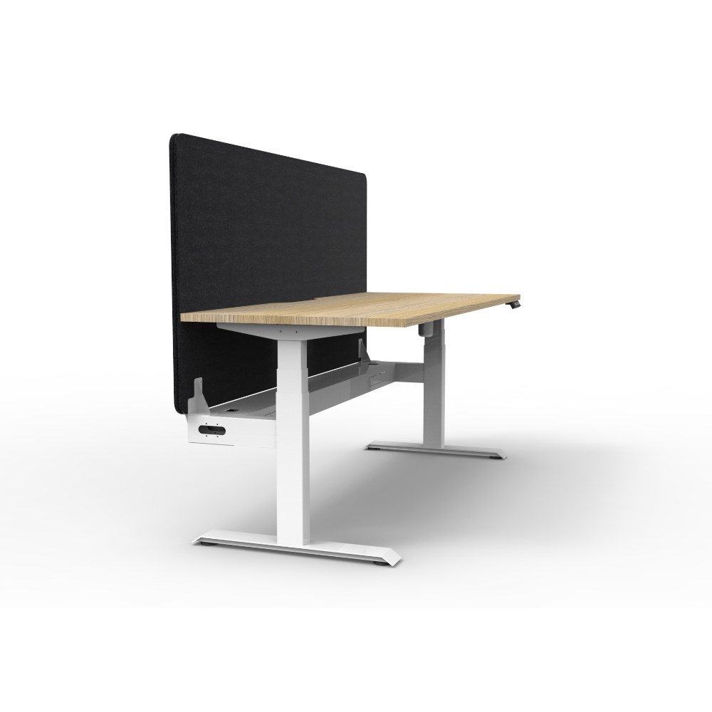 • Electric height adjustable single sided workstation with Natural Oak top and White Satin frame, Black Eco screen and cable tray.