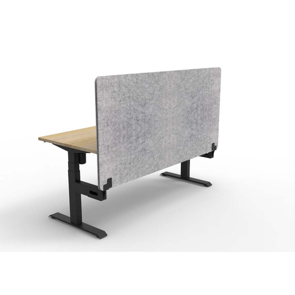 • Electric height adjustable single sided workstation with Natural Oak top and Black Satin frame, Grey Eco screen.