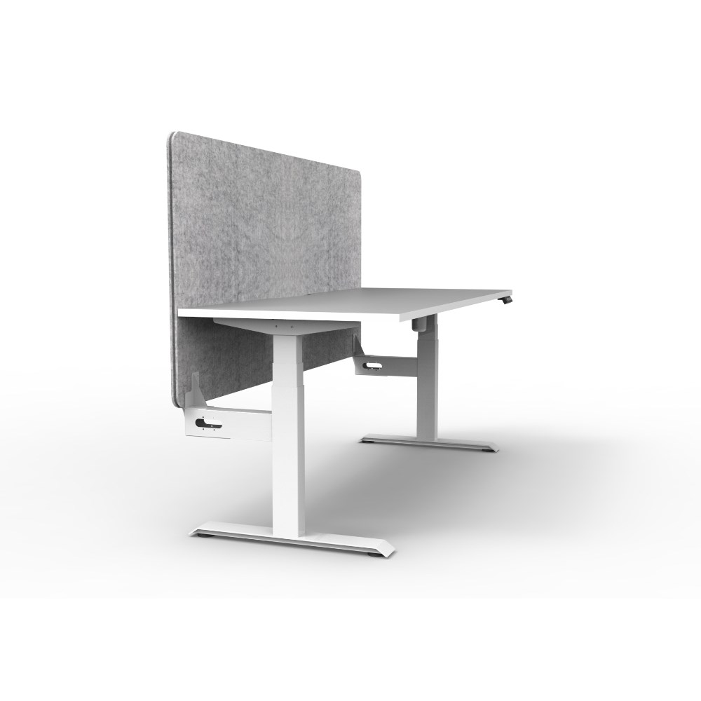 • Electric height adjustable single sided workstation with Natural White top and White Satin frame, Grey Eco screen.