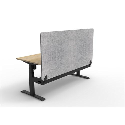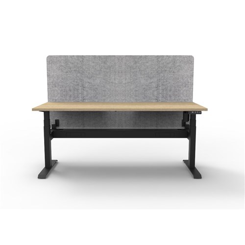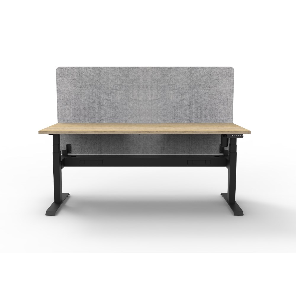 • Electric height adjustable single sided workstation with Natural Oak top and Black Satin frame, Grey Eco screen and cable tray.