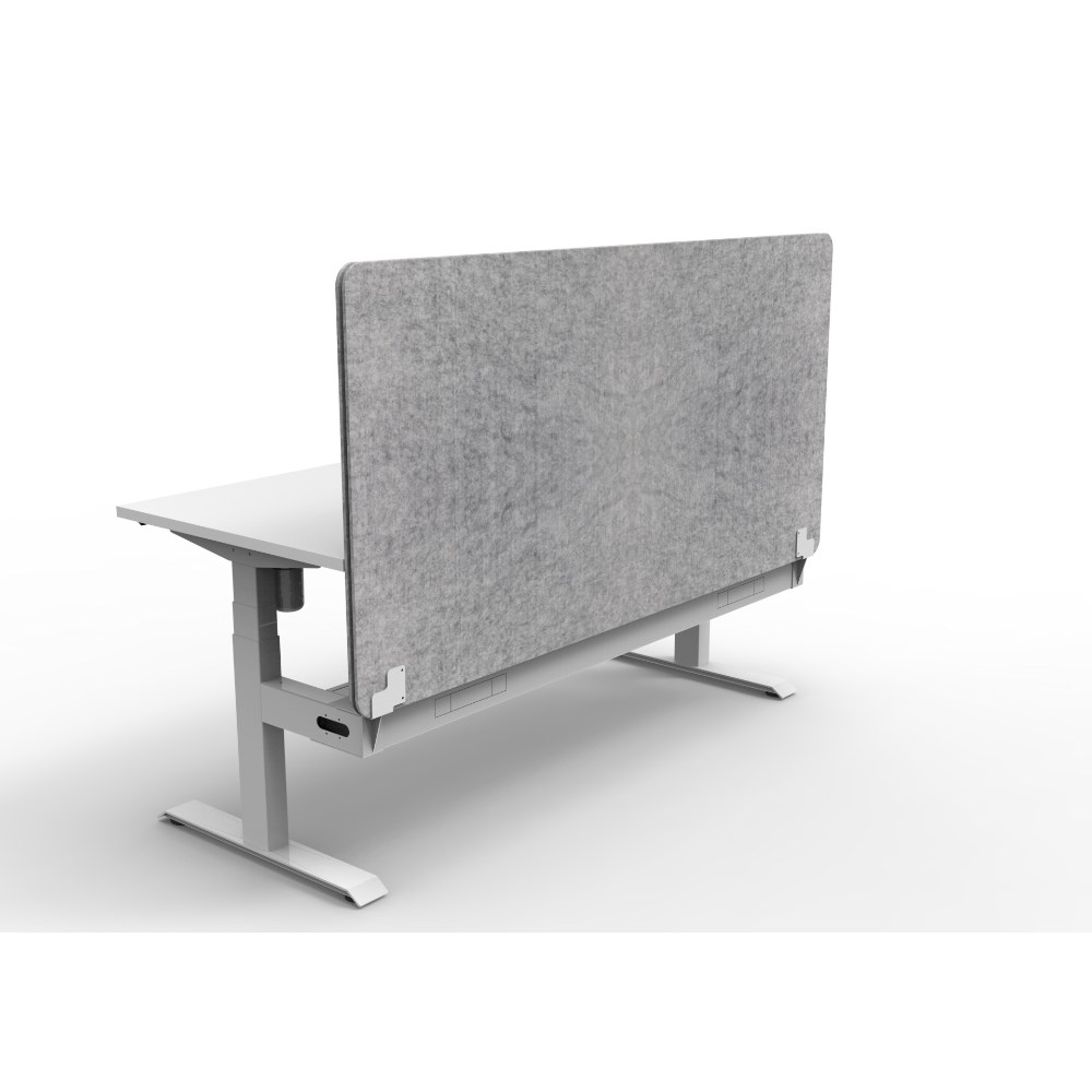 • Electric height adjustable single sided workstation with Natural White top and White Satin frame, Grey Eco screen and cable tray.