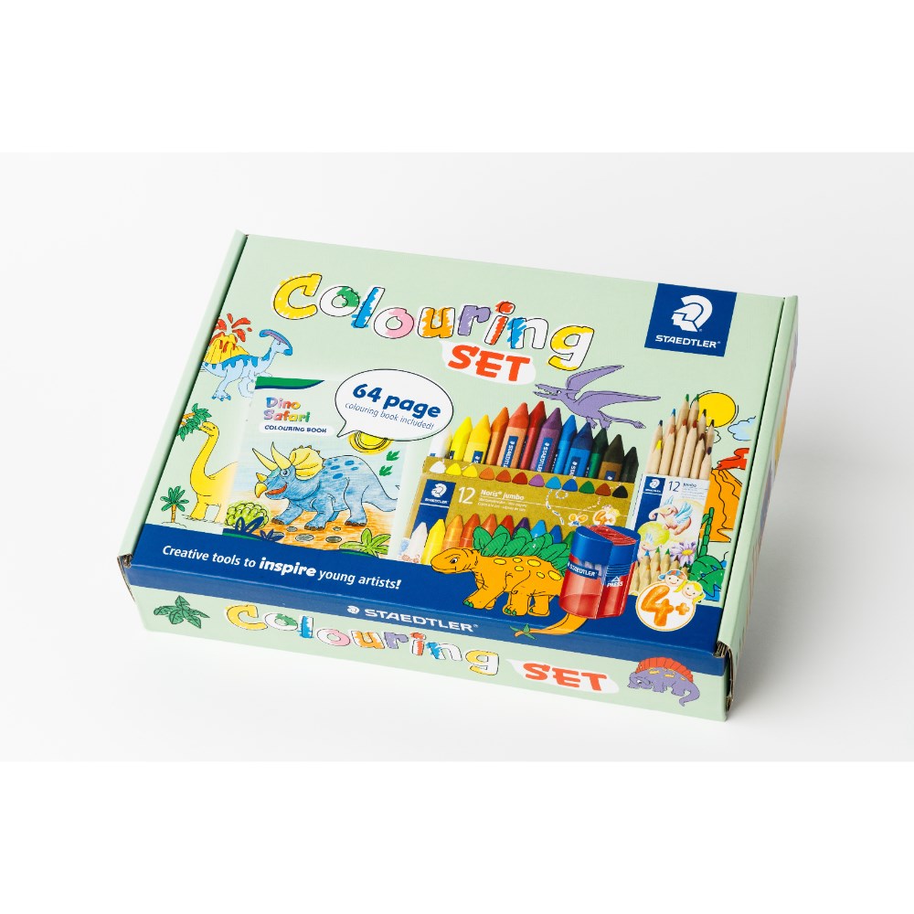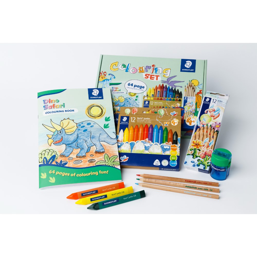 • Includes 64 page colouring book, 12 Natural Jumbo Triangular Coloured Pencils, 12 Noris Jumbo Triangular Wax Crayons and 1 Piece Double Hole Tub Sharpener.