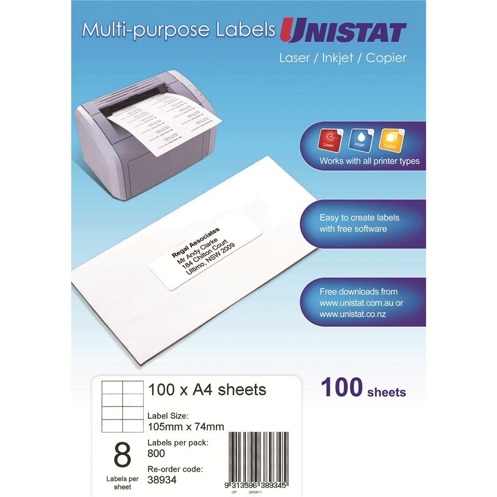 Unistat Laser Copier & Inkjet Labels 105x74mm 8UP 800 labels 100 sheets