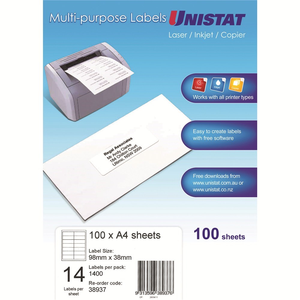 Unistat Laser Copier & Inkjet Labels 98x38mm 14UP 1400 Labels 100 Sheets