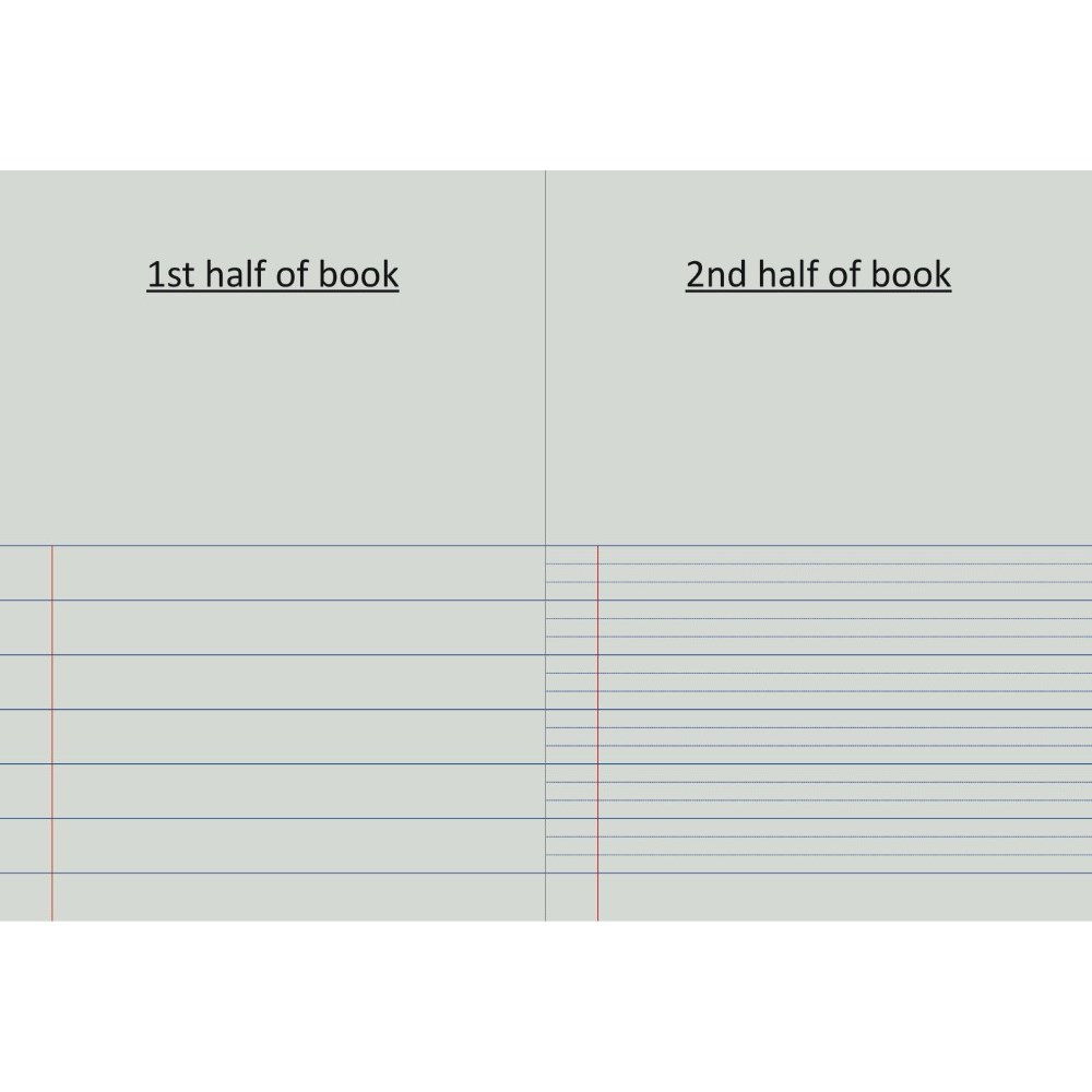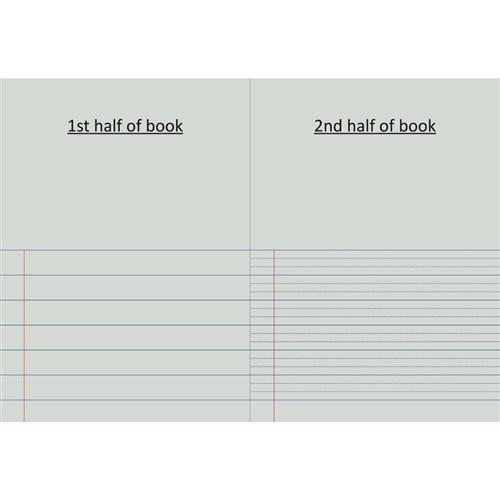 • 1/2 page plain, 1/2 page ruled, 24mm solid to 24mm dotted thirds ruled + red margin.